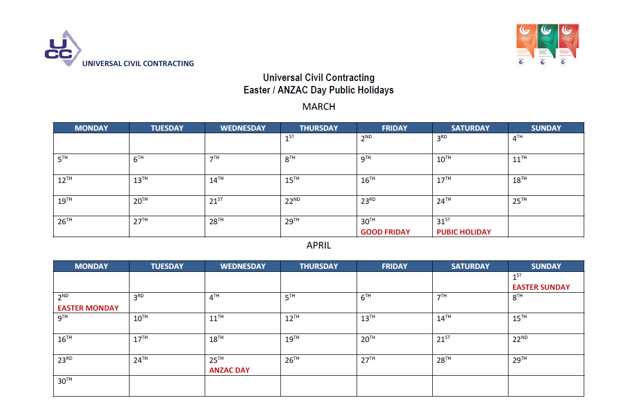 Easter and ANZAC Day 2018 – UCC Public Holiday Dates